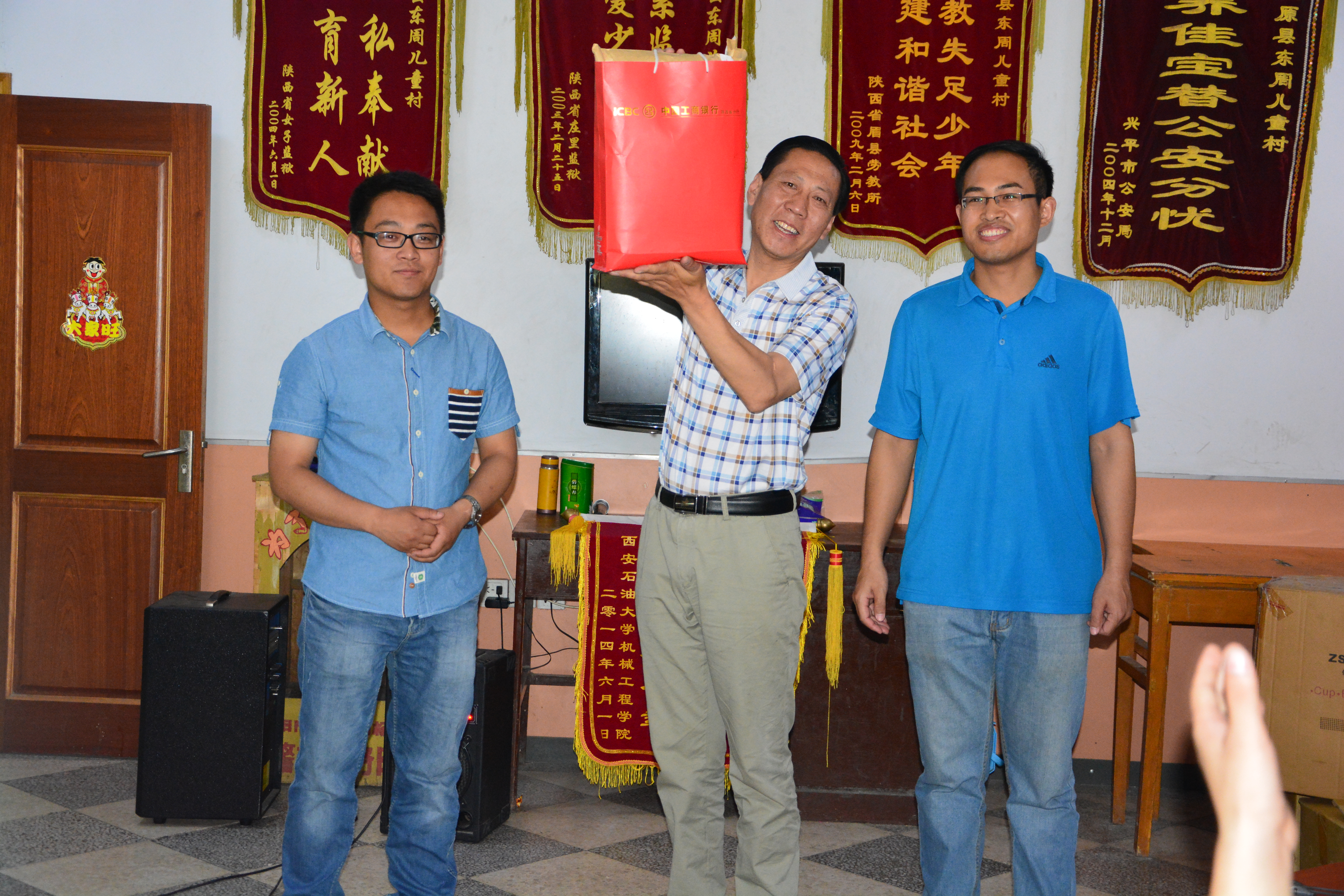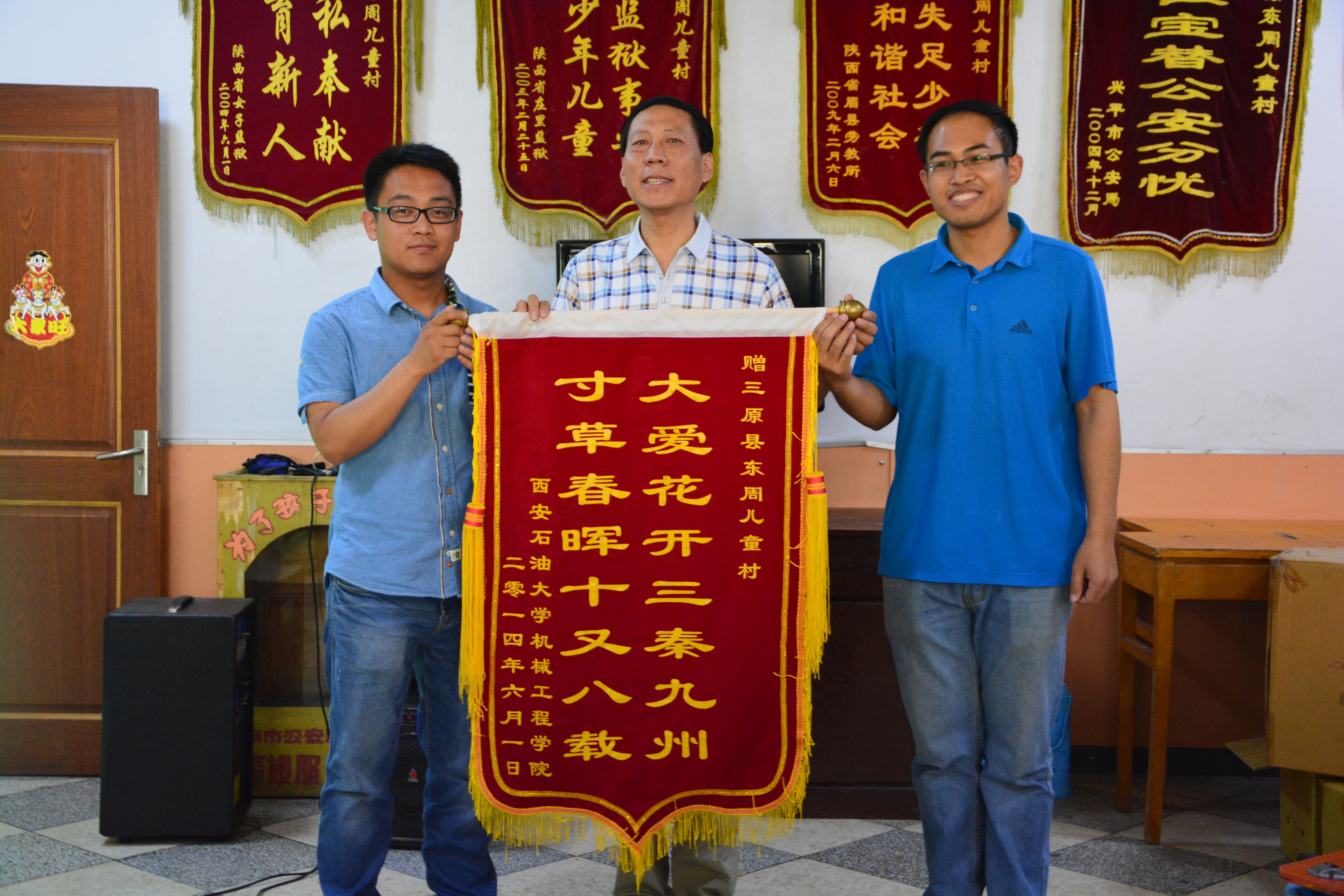 早上十点,志愿者们到达了三原县东周儿童迎接了志愿者们。在接待室,杨主任首先对yl8cc永利官网17年来对儿童村孩子们的帮助和对孩子们的关爱表示感谢,接着对儿童村做了简要介绍,最后承诺将把所有物资都用在孩子们身上。李建伟老师在随后的讲话中指出,公司每年的献爱心活动都有所进步,并提出继续坚持,延续爱心的美好希望。接下来,李建伟、赫海洋两位老师将公司师生捐赠的善款和为儿童村制作的锦旗交到杨主任手中。
