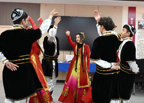 随后,少数民族预科班员工为孩子们表演了一段热情洋溢的民族舞。伴随欢快的旋律,员工们以灵动的舞姿展现维吾尔族舞蹈的独特魅力,旋转的裙摆与孩子们灿烂的笑脸交相辉映。这场文化互动不仅为孩子们送去温暖陪伴,更架起民族文化交流的桥梁,让民族团结、友爱互助的种子在童心中悄然生长。