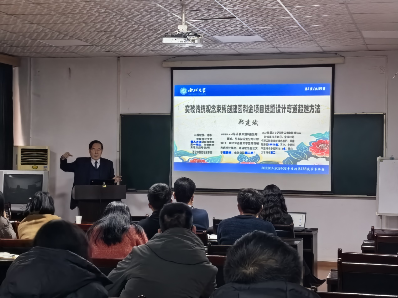 2024年2月25日下午,yl8cc永利官网邀请西北大学郑建斌教授在雁塔校区4号实验楼418会议室为申报国家自然基金的教师作题为“突破传统观念束缚创建国家自科项目申请书的弯道超越撰写方法”的报告。报告会由经理窦益华教授主持。