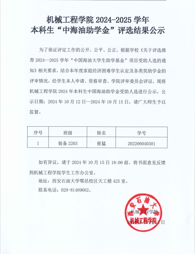 yl8cc永利官网2024-2025学年本科生“中海油助学金”评选结果公示
