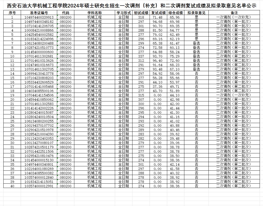现将公司2024年硕士研究生招生一次调剂(补充)和二次调剂(0802机械工程)复试成绩予以公示。